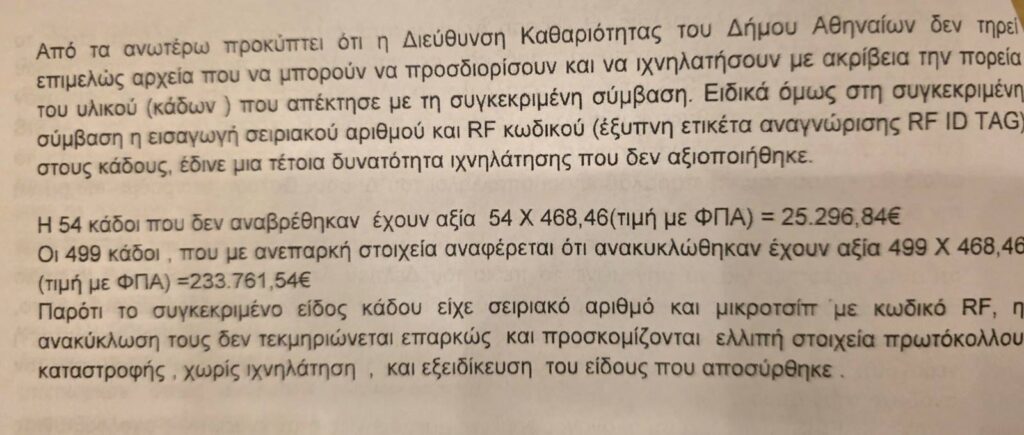 Τρίτον, σύμφωνα με την πρώτη αναφορά του ΣΔΟΕ -την οποία έχει στα χέρια της το ΒΝ- ο δήμος Αθηναίων κατέθεσε ελλιπή και ανεπαρκή στοιχεία για την ανακύκλωση 499 κάδων που να προσδιορίζουν ακριβώς ποιο υλικό ανακυκλώθηκε, την προέλευση των κάδων (από ποια σύμβαση προέρχονται και ποια είναι η συγκεκριμένη παρτίδα. Που πήγαν αυτοί οι 499 κάδοι κανείς δεν γνωρίζει. Σημειωτέον, οι 499 κάδοι κοστίζουν 233.761 ευρώ και μετά από γενική απογραφή στον δήμο και στην αρμόδια διεύθυνση λείπουν.