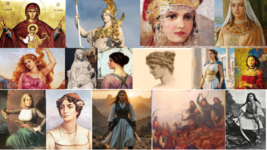 Πριν αναφερθούμε στις άλλες Ελληνίδες, θα πρέπει να τηρήσουμε το «από Θεού άρξασθαι». Οι Έλληνες ανυψώσαμε την γλυκιά Θεία γυναικεία μορφή της Θεοτόκου δίπλα στην Αγία Τριάδα, αλλά κυρίως τοποθετήσαμε την Παναγία μας στο πιο ζεστό μέρος της καρδιάς μας. Είναι η προστάτης, η αρωγός, η παρηγορήτρια μας και ταυτόχρονα η υπέρμαχος Στρατηγός που έχει οδηγήσει και σίγουρα θα οδηγήσει ξανά τον Στρατό μας σε νίκες. Έτσι και οι πρόγονοί μας είχαν ακόμα και στο Θείο ισότιμη τη γυναίκα με τον άνδρα. Στο αρχαιοελληνικό πάνθεον υπήρχαν ισάριθμες γυναίκες και άνδρες θεοί. Η γυναίκα Ρέα και η Ήρα είναι η αφετηρία της δημιουργίας του κόσμου, η Αθηνά είναι η θεά της σοφίας και του δίκαιου πολέμου, η Θέμις της δικαιοσύνης, η Δήμητρα της γονιμότητας και της γεωργίας κλπ. Μάλιστα στους αρχαίους προγόνους μας οι γυναικείες θεότητες υπερτερούσαν αριθμητικά και ποιοτικά, καθώς δίπλα σε όλες αυτές τις θεές υπήρχαν οι Νύμφες, οι Νηρηίδες, οι Δρυάδες και κυρίως οι Μούσες, οι προστάτιδες των τεχνών και των γραμμάτων. Γυναικείες μορφές επέλεξαν οι προγονοί μας για να προστατεύουν ότι αποκαλούμε ανώτερο πνευματικό πολιτισμό. Οι προγονοί μας όχι μόνο αφιέρωσαν το υπέρτατο μνημείο του πολιτισμού στην Αθηνά Παρθένο αλλά το στόλισαν και με γυναικείες μορφές, καθώς στη δυτική πλευρά του Παρθενώνα υπήρχαν 14 μετόπες με θέμα τους την Αμαζονομαχία. Τις Αμαζόνες, αυτόν τον γυναικείο λαό που κατάγονταν από τον θεό του πολέμου Άρη και τη Νύμφη Αρμονία.
