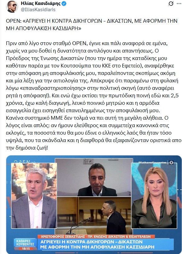 «Πριν από λίγο στον σταθμό OPEN, έγινε και πάλι αναφορά σε εμένα, χωρίς να μου δοθεί η δυνατότητα αντιλόγου και απαντήσεως. Ο Πρόεδρος της Ένωσης Δικαστών (που την ημέρα της καταδίκης μου καθόταν παρέα με τον Κουτσούμπα του ΚΚΕ στο Εφετείο), αναφέρθηκε στην απόφαση μη αποφυλάκισής μου, παραλείποντας σκοπίμως ακόμη και μία λέξη για την αιτιολογία της. Απέκρυψε ότι παραμένω στη φυλακή λόγω «επαναδραστηριοποίησης» στην πολιτική σκηνή (αυτό αναφέρει ρητά η απόφαση!). Και ενώ έχω εκτίσει την πρωτόδικη ποινή εδώ και 2,5 χρόνια, έχω καλή διαγωγή, λευκό ποινικό μητρώο και η αρμόδια εισαγγελία έχει εισηγηθεί επανειλημμένως την αποφυλάκισή μου.